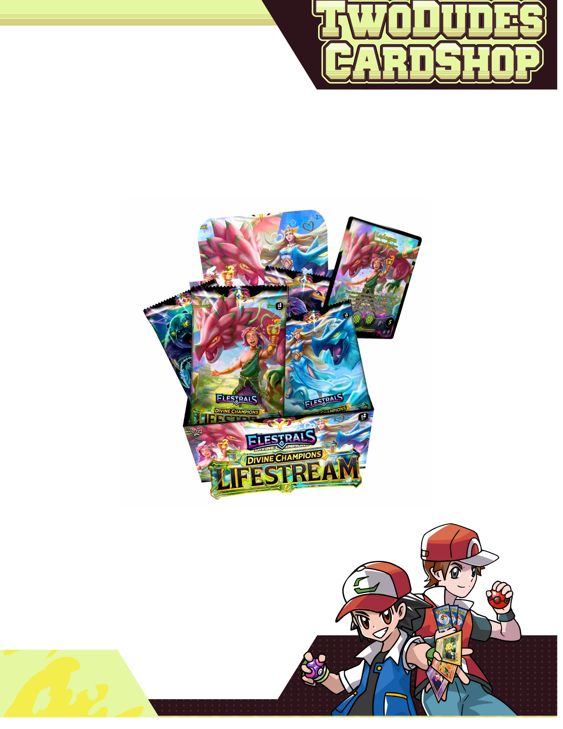 Get ready for the exciting new set of Elestrals, Divine Champions – Lifestream! Each Booster Display contains 24 10-card packs. Step into the radiant currents and discover the might of the Divines themselves, Dionysus and Aphrodite!